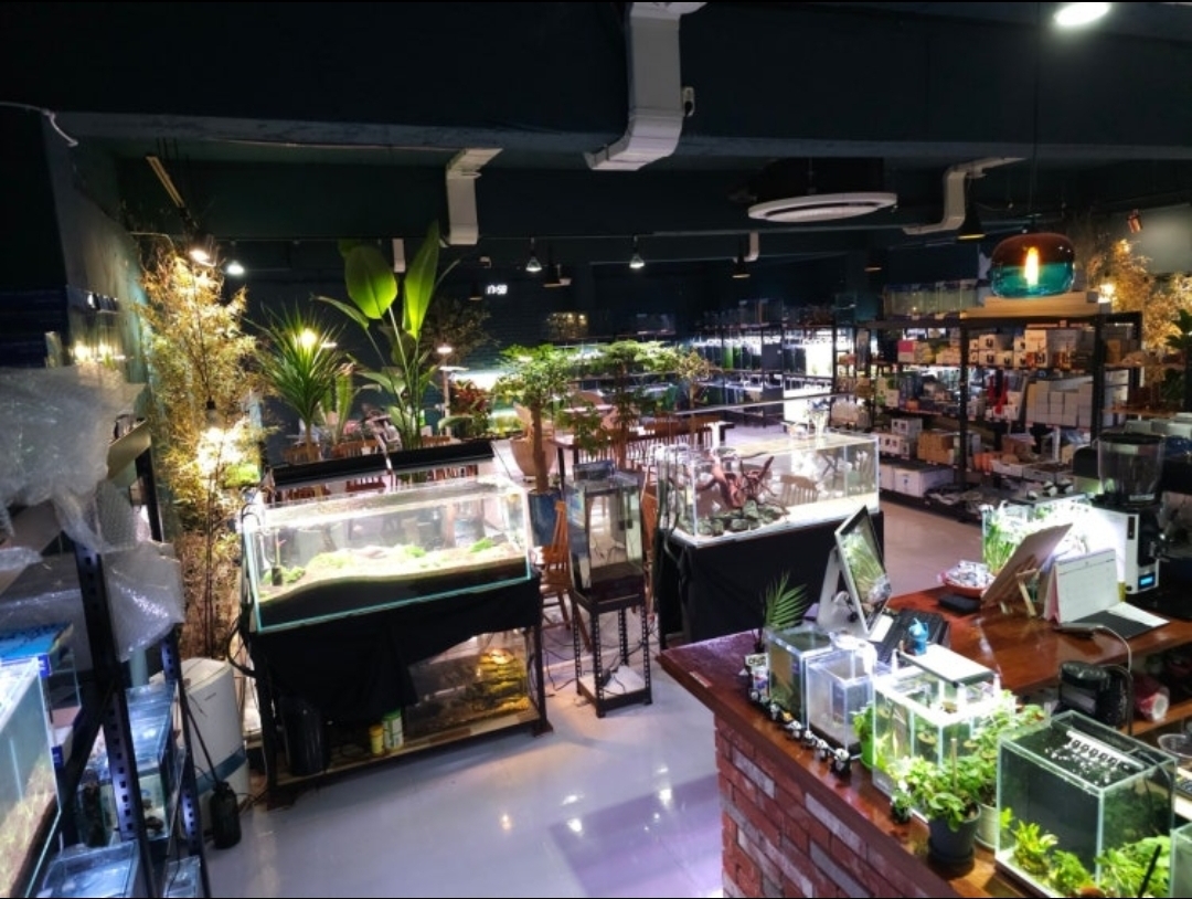 알풀/플래티늄화이트/코코아로즈/블랙메탈스네이크스킨/블루메탈스네이크스킨/오션블루/HB로즈/몽키바나나/HB오팔/플래티늄하프블랙파스텔/옐로우글라스밸리/하스타투스/카디날테트라/네온테트라/러미노즈테트라/골든볼라미네즈/알비노글든스트라이트코리/화이트팬더코리/시클리드/블러드메리새우/블루벨벳새우/CRS/나나/콩나나/수초 및 허브류 식물이 있습니다. 지하공간이지만 환기시스템을 적용하여 쾌적한 실내 공간으로 운영 중입니다.